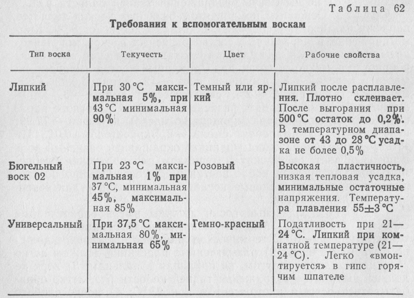 В процессе изготовления протезов при выполнении некоторых операций (пайка и др.) требуются вспомогательные воски, обладающие рядом специфических свойств (липкость, податливость при определенной температуре, высокая текучесть и др.). К вспомогательным воскам можно отнести липкий, бюгельный и универсальный.