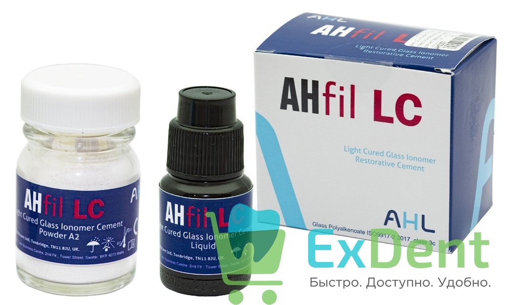 AHfil LC (Цвет А3) - Cтоматологический cтеклоиономерный цемент для реставрации, модифицированный (усиленный) композитной смолой. Светоотверждаемый цемент, твердеющие в результате химического взаимодействия кислотно основного типа и, дополнительно, для ускорения процесса твердения и достижения оптимальных свойств цемента, под воздействием активирующего света (для активации реакции мономера (смолы)).
