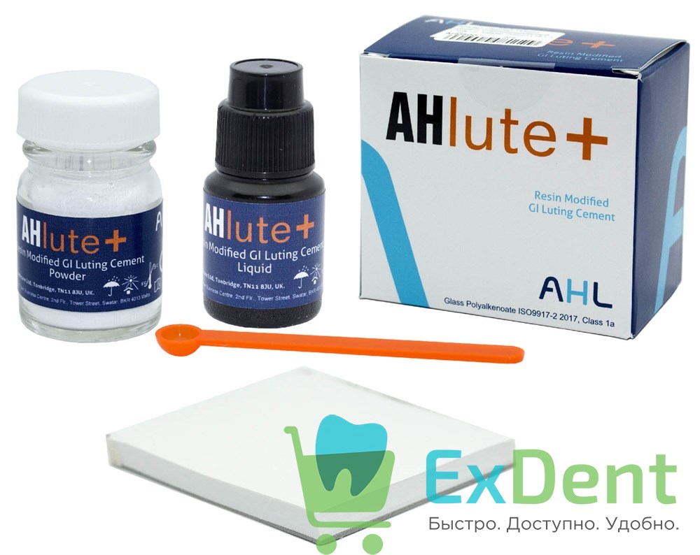 AHlute + Cтоматологический стеклоиономерный самоотверждаемый цемент, модифицированный композитной смолой (мономером). Цемент двойного отверждения. Для фиксации различных ортопедических (коронки, мостовидные протезы, вкладки, накладки (inlays, onlays) и некоторых ортодонтических конструкции. Производитель: AHL, Англия.