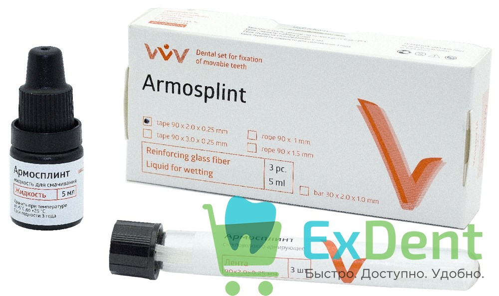 Стекловолокно «Армосплинт» представляет собой ленту специального высокомодульного плетения. Основа ленты - стекловолоконные нити, оплетенные полиэфирными микроволокнами (ширина ленты 2,0 и 3,0 мм, толщина - 0,25 мм). Лента силанизирована для улучшения связи с композитом.