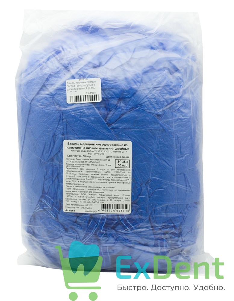 Купить Бахилы прочные Элегрин Экстра Плюс, голубые с двойной резинкой (8 мкм) (100 шт) произведенный компанией вы можете в ExDent.ru по цене 0руб.