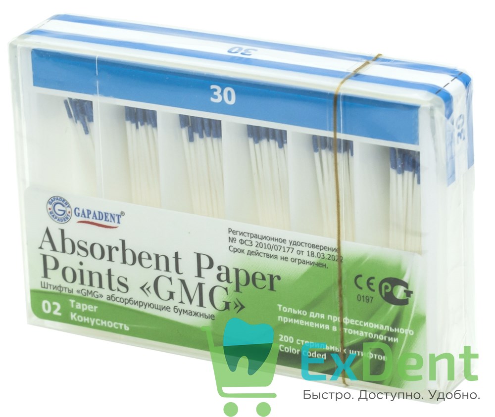 Купить Бумажные штифты 02 №30 GMG - для удаления влаги в канале (200 шт) произведенный компанией GMG вы можете в ExDent.ru по цене 0руб.