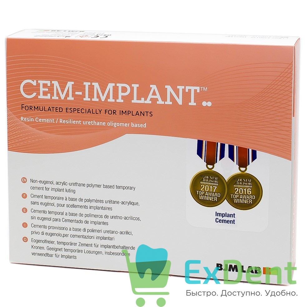 Cem-implant (Цем имплант) Auto Mix — материал, используемый стоматологами в реставрационных работах. Активно применяется для создания временных конструкций длительного периода ношения, а также для производства имплантов. Цемент производится в Израиле. Препарат сделан на основе композита, отверждается посредством химического воздействия в течение пяти минут. Cem-implant не содержит эвенгола, а значит, риск возникновения аллергических реакций сведен к минимуму. Композит удобен в использовании, не имеет вкуса и запаха, быстро адаптируется в ротовой полости, обеспечивая надежную и крепкую посадку, при этом временную конструкцию при необходимости можно легко снять. Начальное отвердение характеризуется резиноподобной консистенцией. В этот момент лишние части цемента можно с легкостью удалить, воспользовавшись щупом.