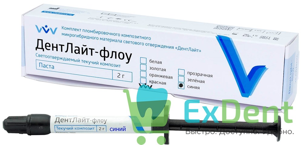 Купить ДентЛайт-флоу, паста, цвет синий - светоотверждаемый композитный материал (1 х 2 г) произведенный компанией ВладМиВа вы можете в ExDent.ru по цене 450руб.