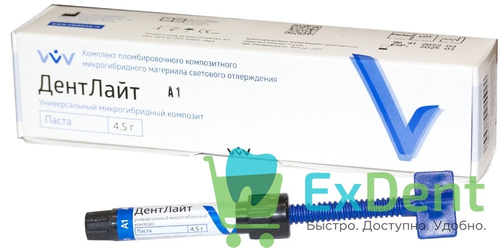 Купить ДентЛайт, оттенок А1 - светоотверждаемый композитный материал (1 х 4,5 г) произведенный компанией ВладМиВа вы можете в ExDent.ru по цене 510руб.