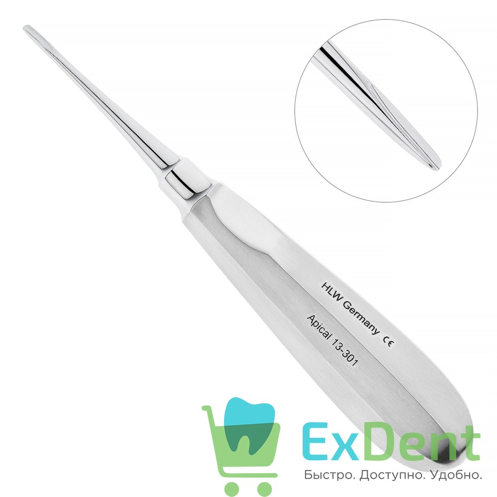 Элеватор апикальный используется для удаления корней зубов верхней челюсти, атипично расположенных зубов верхней челюсти и, в ряде случаев, для удаления третьих моляров нижней челюсти. Производителем инструмента является компания HLW Dental Instruments.