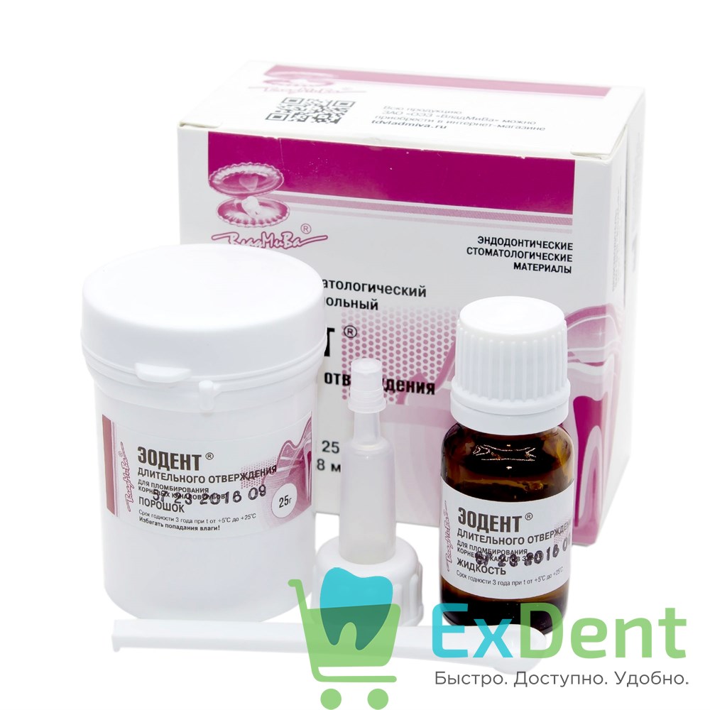 Стоматологический материал Эодент длительного отверждения выпускается в комплекте порошок-жидкость. Порошок содержит окись цинка, гидроксиапатит, стимулирующий регенерацию костной ткани и рентгеноконтрастный наполнитель. Жидкость содержит эвгенол с пластифицирующими добавками, которые способствуют увеличению наполненности системы порошок-жидкость при замешивании и снижению растворимости материала в канале.
