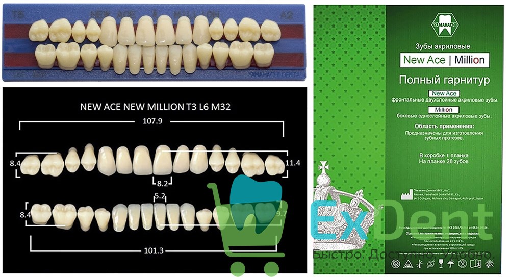 Купить Гарнитур акриловых зубов A2, T5, M32, Million и New Ace (28 шт) произведенный компанией YAMAHACHI вы можете в ExDent.ru по цене 300руб.