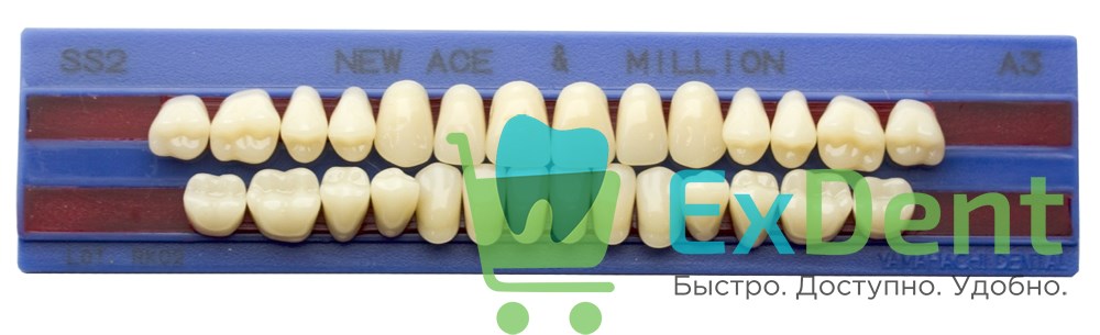 New Ace & New Million зубы акриловые двухслойные и однослойные, полный гарнитур, фасон SS2/S3L M28, цвет A3, 28 шт., фронтальные двухслойные New Ace, верх - фасон SS2, низ - фасон S3L, боковые однослойные New Million - фасон M28