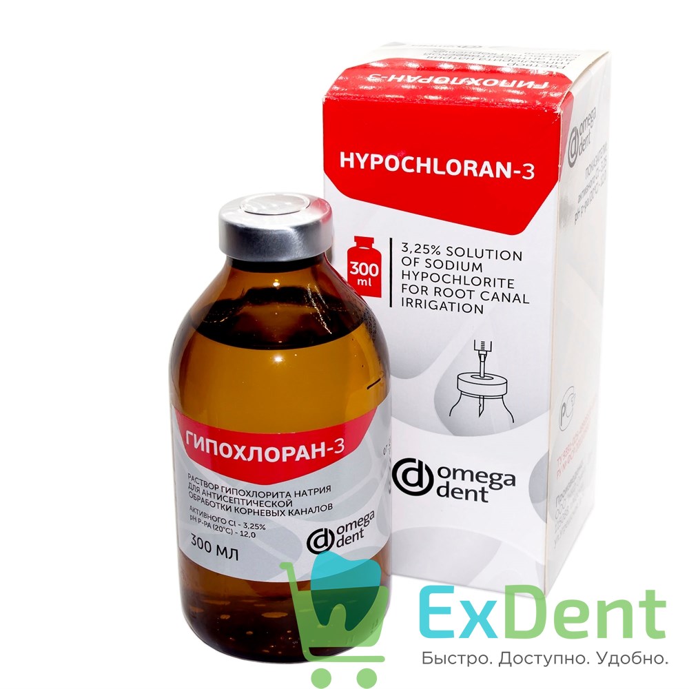 Купить Гипохлоран-3 - раствор гипохлорита натрия для антисептической обработки корневых каналов (300 мл) произведенный компанией ОМЕГА-ДЕНТ вы можете в ExDent.ru по цене 720руб.