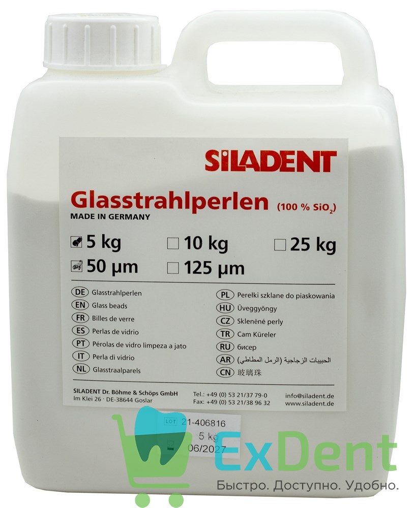 Купить Glass Beads (Гласс Бидс) - стеклянные шарики для тонкой очистки 50 микрон (5 кг) произведенный компанией Siladent вы можете в ExDent.ru по цене 0руб.