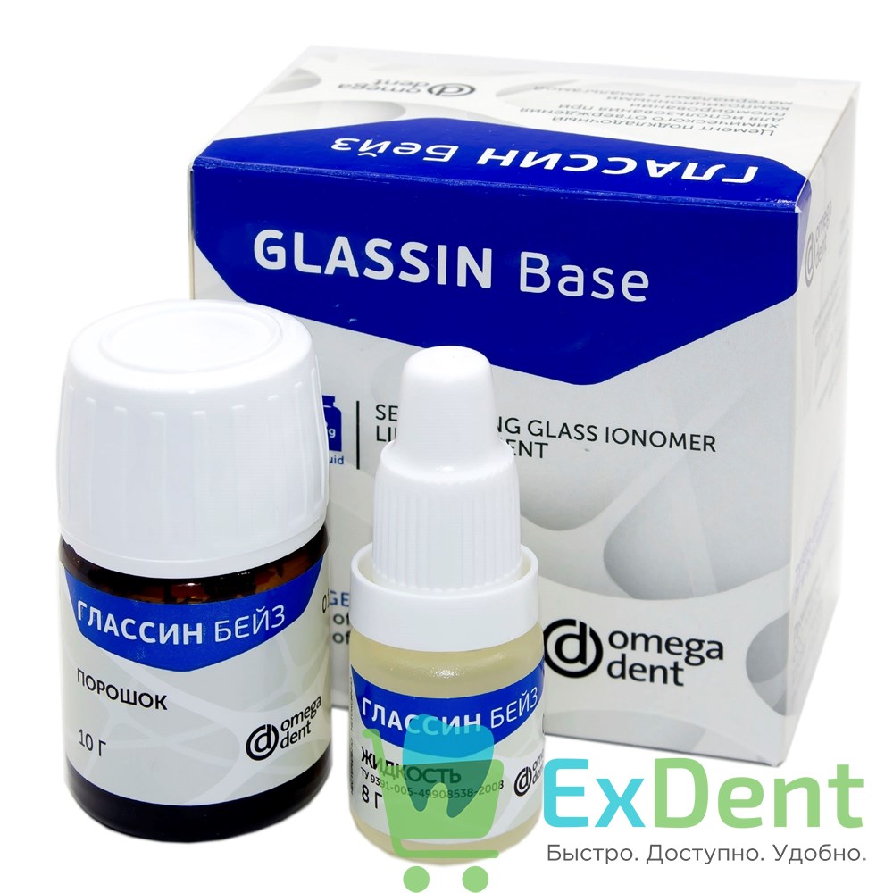 Порошок представлен в виде мелкодисперсного алюминий-кальций латан фторкремниевого стекла с рентгеноконтрастными добавками. Жидкая часть препарата является водным раствором полиакриловой кислоты определенной молекулярной массы с улучшающими ее свойства органическими присадками. Благодаря системе «жидкость + порошок» все дисперсные частицы образованной структуры имеют прочные связи, что предотвращает их вымывание из цемента. ГЛАССИН Бейз обладает химической адгезией к эмали и дентину и характеризуется высокой биологической совместимостью с твердыми тканями зуба, а за счет пролонгированного высвобождения ионов фтора обеспечивает максимальный противокариесный эффект.