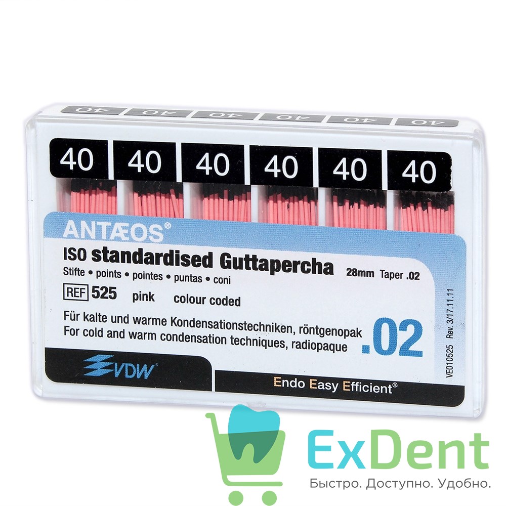 Купить Гуттаперчевые штифты 02 №40 VDW - для пломбирования корневых каналов (120 шт) произведенный компанией VDW вы можете в ExDent.ru по цене 0руб.