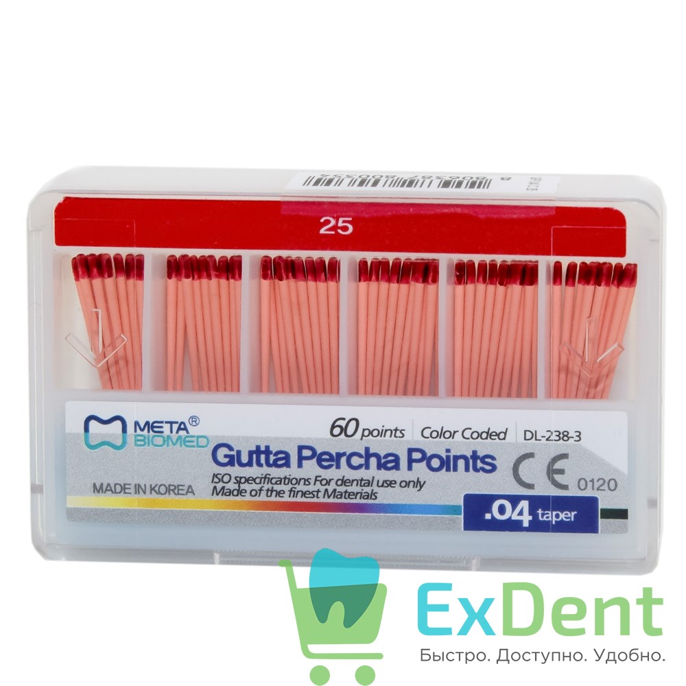 Купить Гуттаперчевые штифты 04 №25 Meta - для пломбирования корневых каналов (60 шт) произведенный компанией META вы можете в ExDent.ru по цене 0руб.