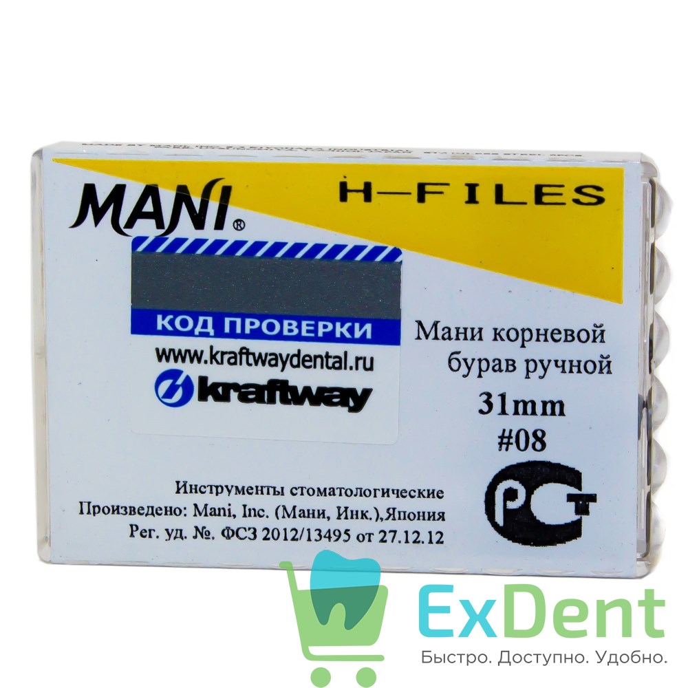 Купить H-Files №08, 31 мм, MANI, корневой бурав, ручной (6 шт) произведенный компанией Mani вы можете в ExDent.ru по цене 370руб.