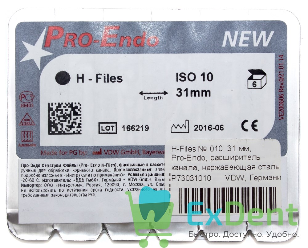 H-Files №10, 31 мм, Pro-Endo, расширитель канала, нержавеющая сталь, нестерильные (6 шт)