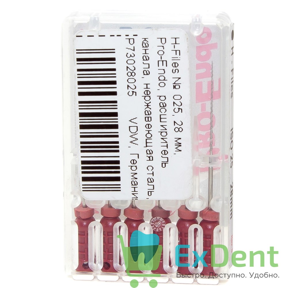 H-Files №25, 28 мм, Pro-Endo, расширитель канала, нержавеющая сталь, нестерильные (6 шт)