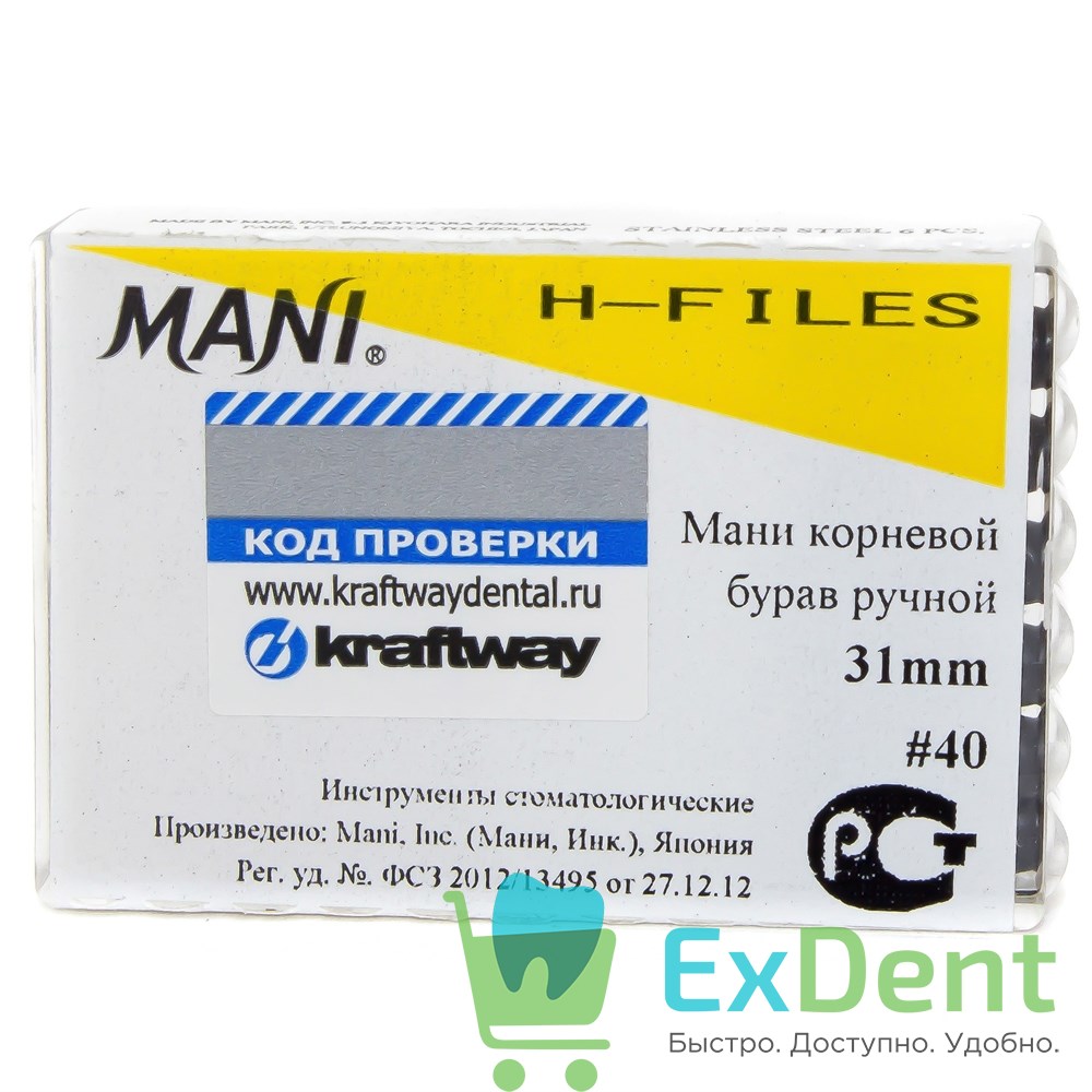 Купить H-Files №40, 31 мм, MANI, корневой бурав, ручной (6 шт) произведенный компанией Mani вы можете в ExDent.ru по цене 350руб.