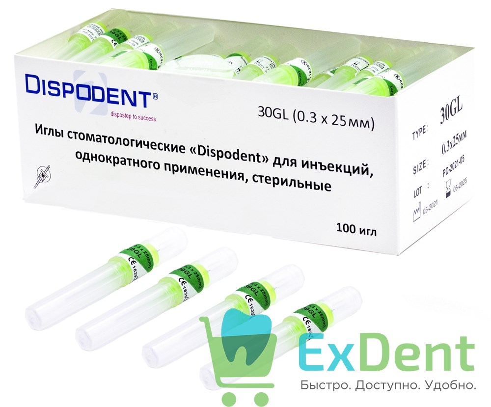 Купить Иглы карпульные (0,3 х 25 мм) 30GL Dispodent (100 шт) произведенный компанией Dispodent вы можете в ExDent.ru по цене 420руб.
