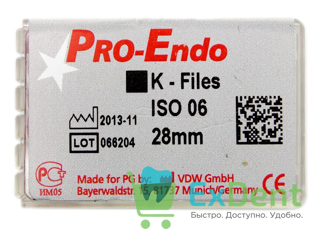 K-Files №06, 28 мм, Pro-Endo, для препарирования канала, нержавеющая сталь (6 шт)