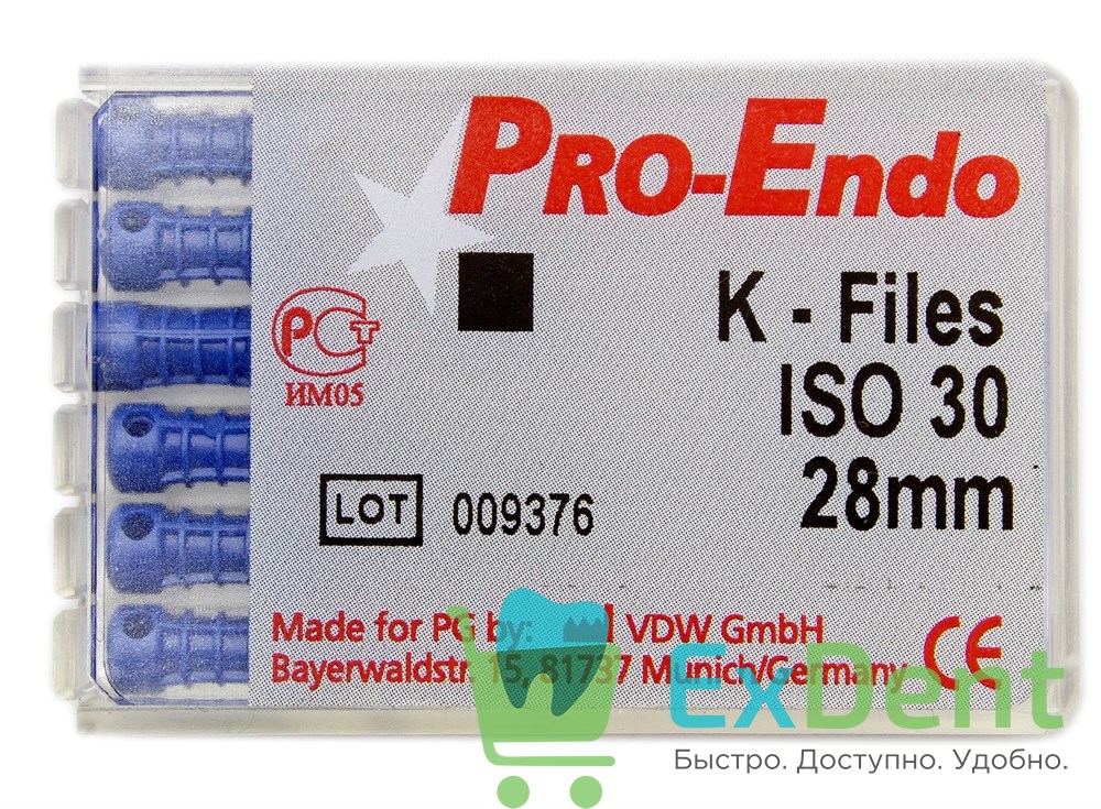 K-Files №30, 28 мм, Pro-Endo, для препарирования канала, нержавеющая сталь (6 шт)
