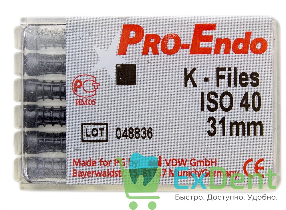 K-Files №40, 31 мм, Pro-Endo, для препарирования канала, нержавеющая сталь (6 шт)