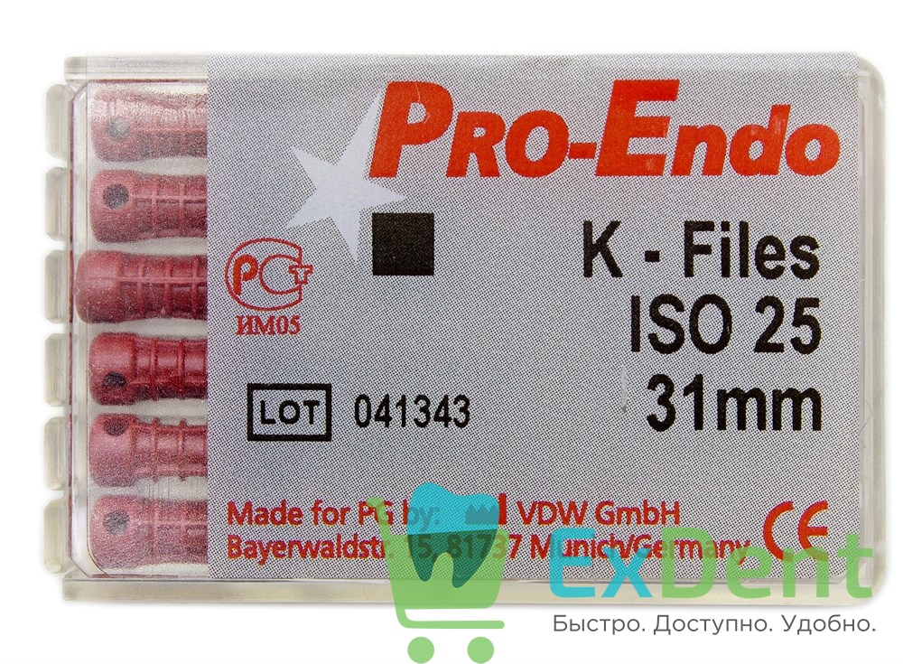 K-Reamers №25, 31 мм, Pro-Endo, для препарирования канала, нержавеющая сталь (6 шт)