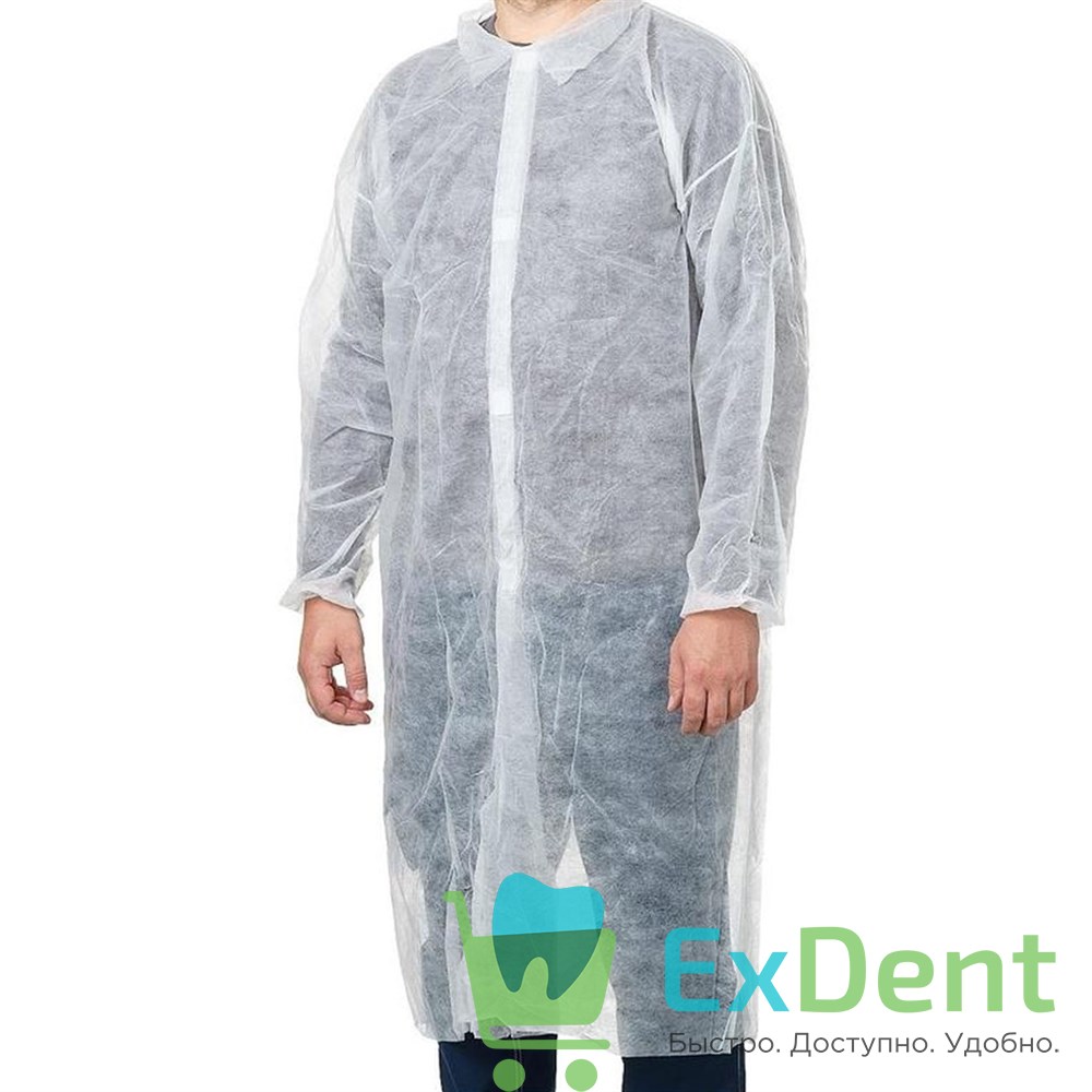 Халат одноразовый белый из нетканого материала спанбонд c центральной застежкой на липучки. Рукава на резинке препятствуют попаданию загрязнений на кожу рук и рукава одежды. Спанбонд — синтетический нетканый дышащий материал. Комфортен в эксплуатации. Плотность 25 (+/- 20%) г/м. кв. Медицинский одноразовый халат является важным средством специальной защиты для сотрудников медицинских учреждений, салонов красоты, пищевых предприятий. Ширина изделия: 140 см. Длина: 110 см.