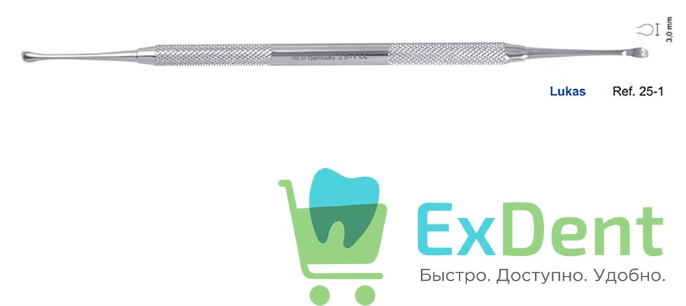 Для удаления мелких фрагментов из лунки, а также кюретажа грануляционных тканей применяется ложка кюретажная Lukas (Лукаса). Производителем инструмента является компания HLW Dental Instruments.