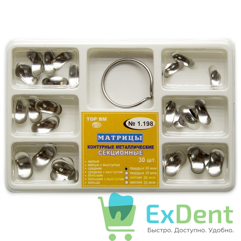 Купить Матрицы металлические секционные, набор 6 видов + кольцо, твердые (50 мкм х 30 шт) произведенный компанией ТОР ВМ вы можете в ExDent.ru по цене 480руб.