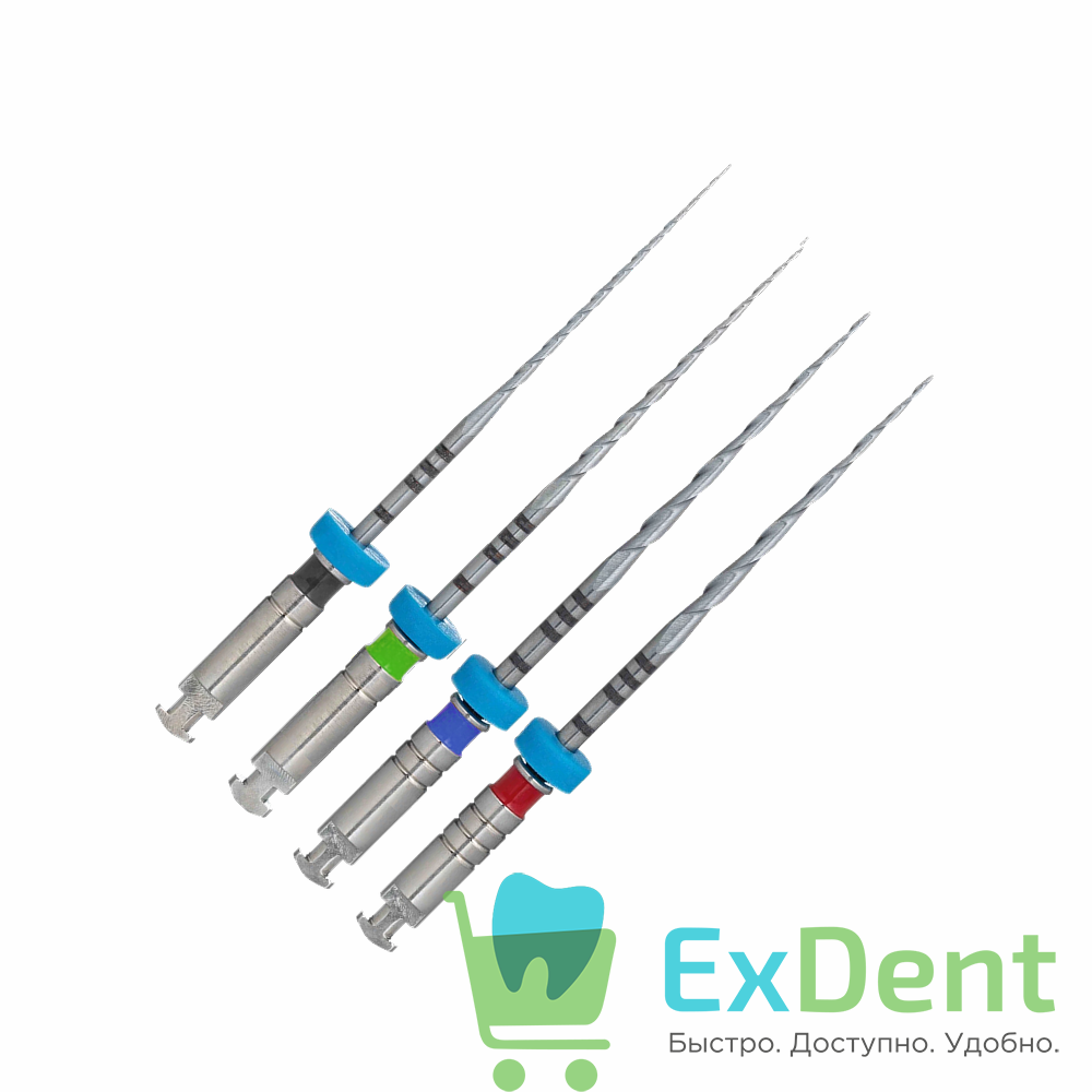Расстояние между режущими лезвиями увеличивается от кончика к рукоятке. Частая резьба у верхушки ликвидирует инфекцию у апекса, а более редкая у основания — формирует канал, сводя к минимуму риск заклинивания и образования пробки.