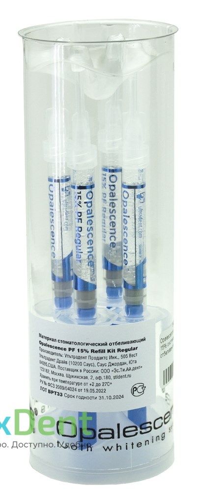 Комплект поставки:- Opalescence PF 15% – 4 шприца по 1,2 мл.