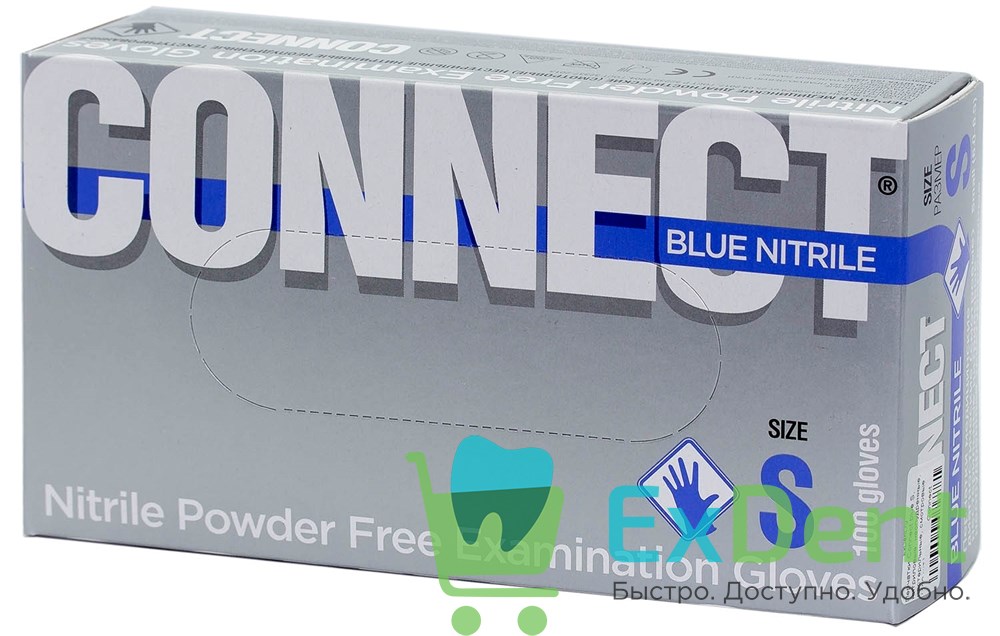 Купить Перчатки Connect blue S, нитриловые, неопудренные, нестерильные, смотровые (100 шт) произведенный компанией Connect вы можете в ExDent.ru по цене 320руб.