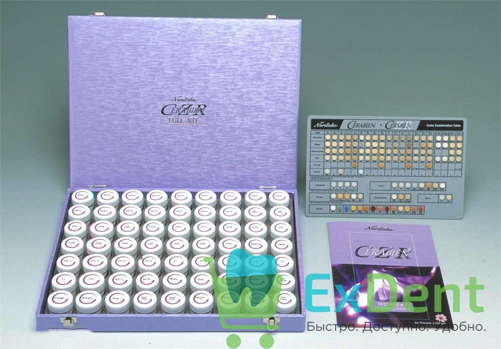 Профессиональный набор керамической массы "CZR". Включает в себя все существующие оттенки дентинов и порошковых опаков групп А, В, С и D, эмали, транспаренты и пришеечные массы для них, фарфоры для коррекции, модификаторы дентинового слоя.