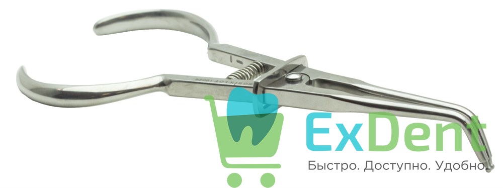 Щипцы для Коффердама с шариком - изогнуты по плоскости. Имеют сферической формы кончики для предотвращения соскакивания клампа при его растягивании. Между ручками имеется пружина возвратного действия. На ручках имеется фиксатор положения браншей.