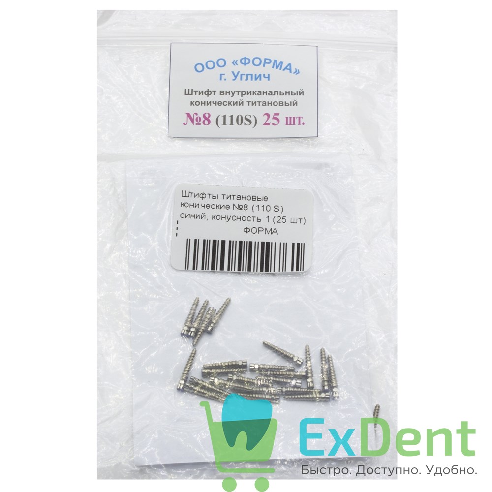 Купить Штифты титановые конические №8 (110 S) синий, конусность 1 (25 шт) произведенный компанией ФОРМА вы можете в ExDent.ru по цене 0руб.