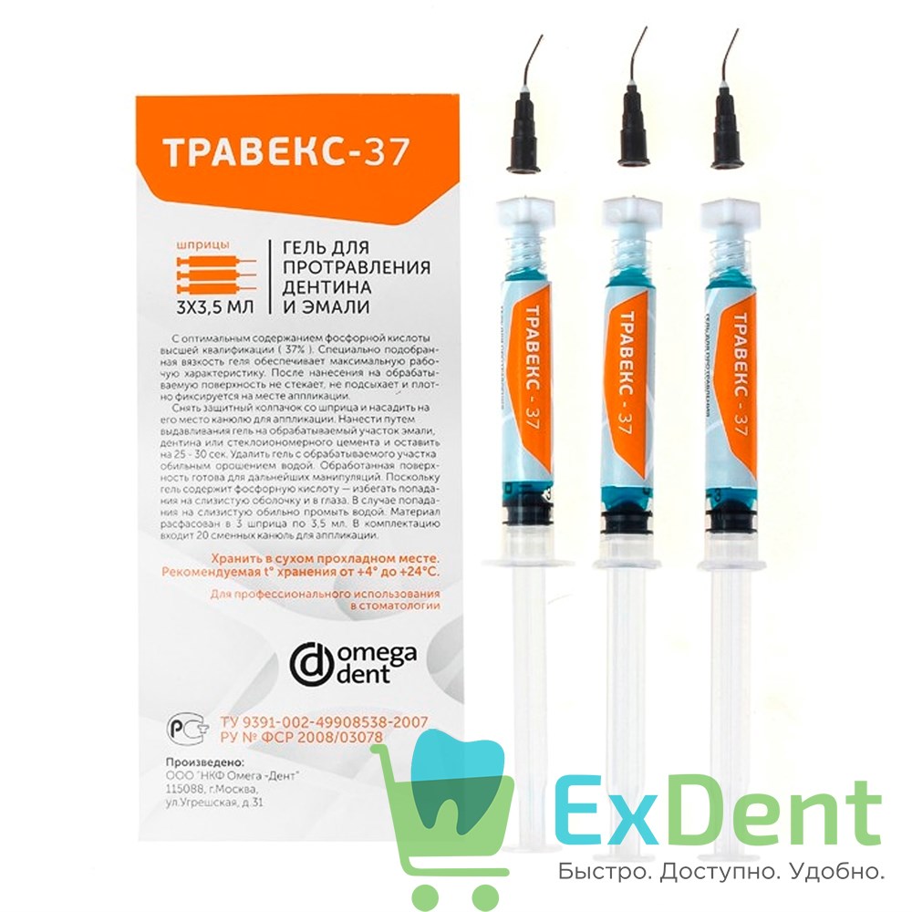 Купить Травекс-37 - гель для протравливания эмали и детина (3 х 3,5 мл) произведенный компанией ОМЕГА-ДЕНТ вы можете в ExDent.ru по цене 540руб.